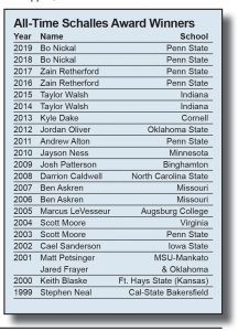 Photo: Penn State’s Bo Nickal (right) scored 35 of his career 59 pins the past two winters and earned the Schalles Award each season.